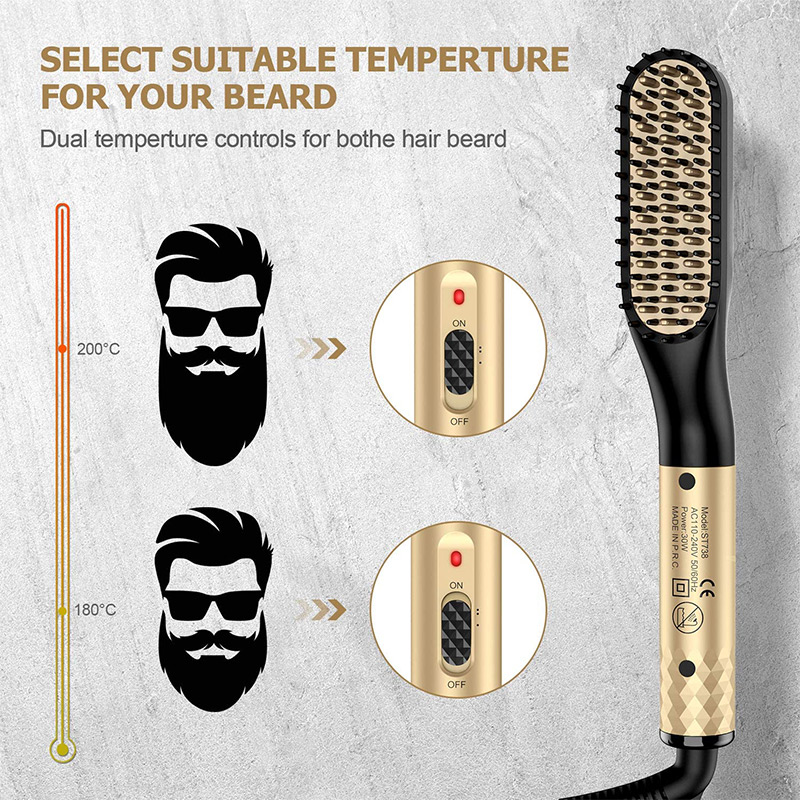 • الفرشاة فيها درجات حرارة قابلة للتعديل. (الضوء الأزرق (180/356 ℉) للحية السميكة أو الخشنة ) –