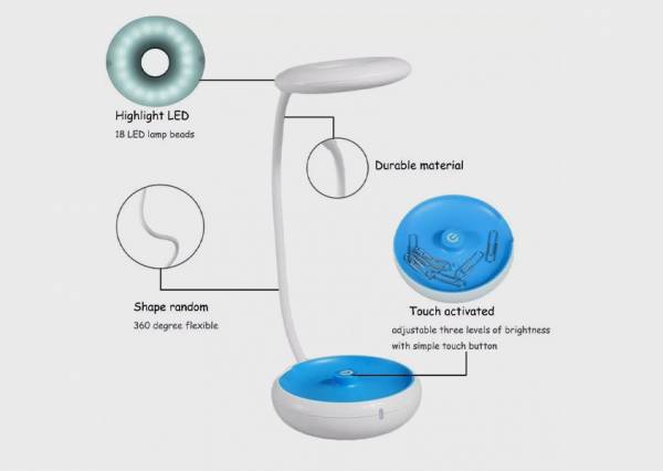 يمكن استخدامها كـ أباجورة مكتب أو وناسة خلال الليل أو كشاف ويتعلق في الايد بسهولة من خلال رقبة الأباجورة المطاطية.